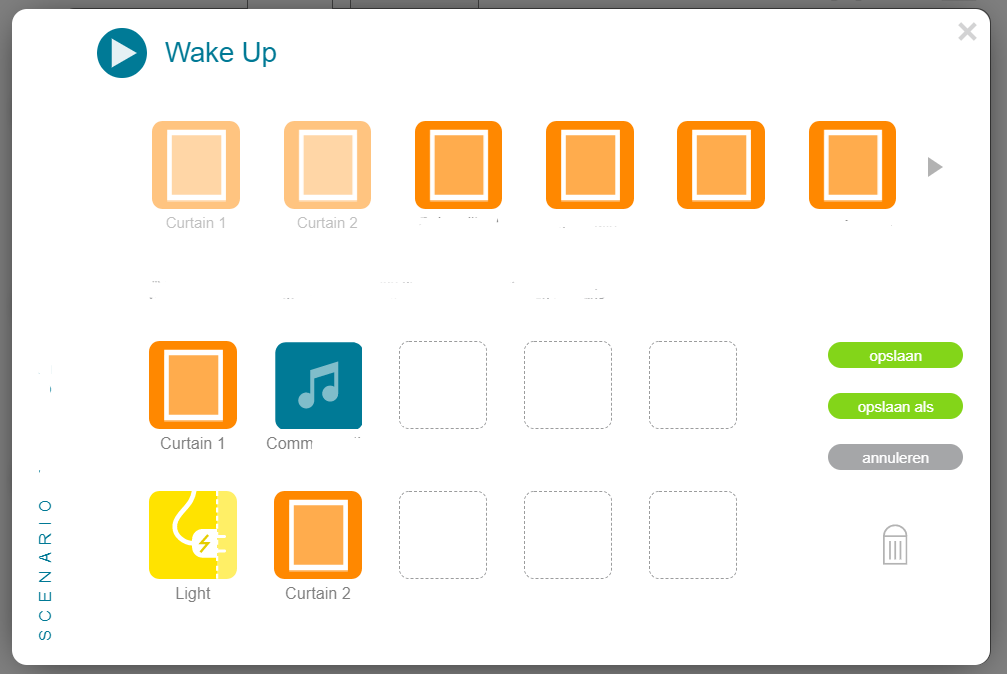 So imagine you want your home set up for the summer months, ‘scenario summer’, it could feature things like having your awnings down, lights off, and blinds up to keep things nice and cool. Or picture your ideal morning ‘wake up’ scenario, ‘scenario morning’, with lamps on, curtains drawn and your favourite morning playlist playing on your speakers so you can go into the kitchen and make yourself a coffee. See example below: